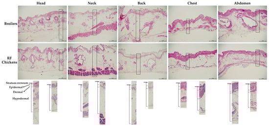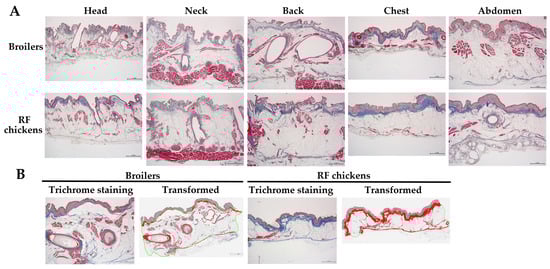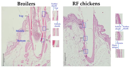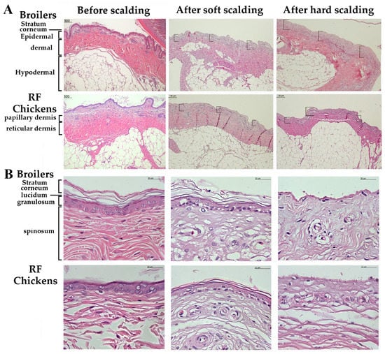 Although scalding methods have been used for a long time in commercial poultry slaughter, very few studies have been conducted to elucidate the fundamental architecture of skin histology of chickens and its interactions with associated feathers in respect to various strains and ages, much less their alterations by temperature. Accordingly, the present study aimed to delineate the intrinsic histology of different parts of skins in RF chickens using broilers at comparable BW as a reference and further examine their thermal alterations under soft and hard scalding processes. Results of this study provide the fundamental histology of skins and their alterations with associated feathers to elucidate the defeathering effects by scalding methods.