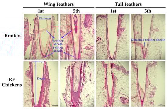 11]. Here we further showed the fundamental skin histology in chickens and its association with feathers in respect to their thermal alterations to elucidate the defeathering effect by scalding process. The differential defeathering effects by scalding in chickens of various breeds and ages were attributed to their intrinsic differences in skin histology and the interaction of feather calamus with the surrounding feather sheath layer and cutaneous tissues, which reflect the resistance to thermal denaturation. The collagenous matrixes in the skin and within the feather follicle in RF chickens are resistant to thermal degeneration and thus more deniable to defeathering effects by scalding. Accordingly, it is interesting to determine the threshold age that birds develop a more resistant architecture in skin and feather follicle histology against thermal disintegration.