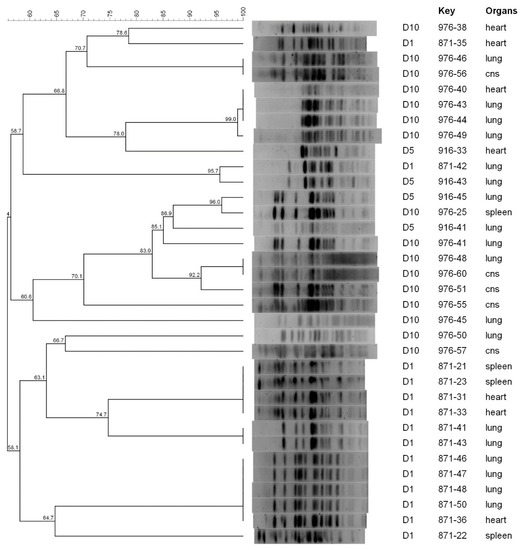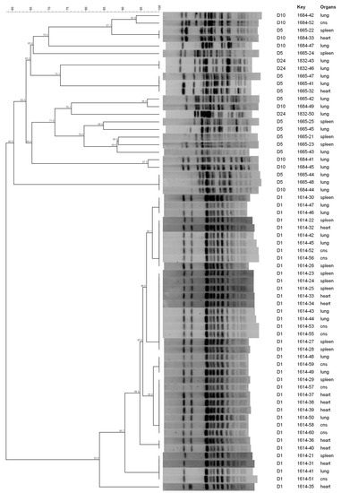 In Farm B, E. coli isolates collected at D1 clustered in three PFGE clusters. In particular, two of them included isolates from different organs (the heart, spleen and lungs) (Figure 2), suggesting that the same strain colonised different organs. Isolates collected after the treatment clustered in a higher number of PFGE clusters: 10, 7 and 2 patterns for D5, D10 and D24, respectively. No similar PFGE patterns were observed between isolates collected before and after treatment (Figure 2). Although, after the treatment, four D5 isolates (1665-22, 1665-42, 1665-44 and 1665-48) showed a similar PFGE pattern to D10 isolates (1684-33, 1684-49 and 1684-44) with similarities ranging from 96.8 to 100%.