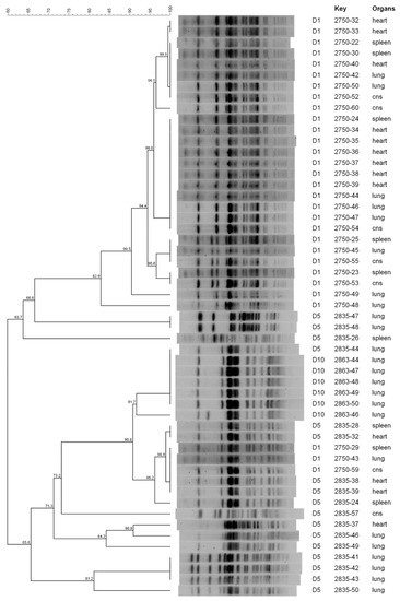 In Farm C, E. coli isolates belonging to D1 clustered in 4 different patterns, whereas 11 different patterns were identified for D5 and D10. Three D1 isolates (2750-29, 2750-43 and 2750-59) shared the same PFGE profile as two D5 isolates (2835-38 and 2835-39) and showed a similarity of 98.9% with two additional D5 isolates (2835-28 and 2835-32). Moreover, one D5 isolate (2835-44) showed the same PFGE profile as five D10 isolates (2863-44, 2863-47, 2863-48, 2863-49 and 2863-50) (Figure 3).