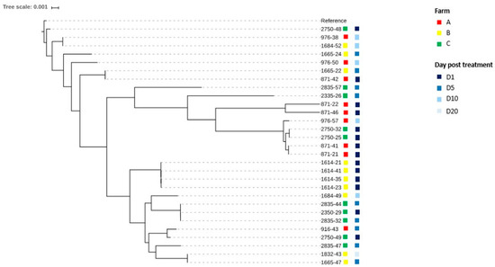 E. coli isolates collected before the antibiotic treatment at D1 shared from 82 to 98,137 SNPs in Farm A, from 44 to 86 SNPs in Farm B and from 109 to 89,968 SNPs in Farm C (Table S3). SNP data confirmed the hypothesis that multiple strains, and not only one, were the causative agents of colisepticemia in all three farms. In particular, in Farm B, SNP calling confirmed the presence at D1 of genetically related strains (all belonging to O78-ST23-H35), which probably share a common ancestor. As was the case for PFGE, also with SNPs, the higher genetic diversity among strains collected from D5 to D10 in comparison to D1 is confirmed (Figure 4 and Table S3).