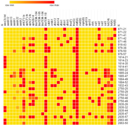 Heatmap of antimicrobial resistance genes in newly sequenced E. coli genomes (identity from 0% (yellow) to 100% (red)).