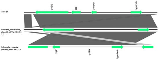 BLAST alignment of qnrB19-carrying contig in E. coli strain 1665-24 with plasmid pRIVM_C014947_7 (Klebsiella pneumoniae MT560070.1) and plasmid pUWI-PP122.1 (Salmonella enterica CP066326.1), performed and visualized with Easyfig 2.2.5 (https://mjsull.github.io/Easyfig/ (accessed on 28 July 2023)).