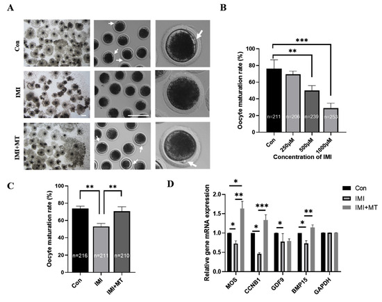 The expansion of cumulus cells and the expulsion of polar bodies are two important indicators of oocyte maturation [34]. Cumulus cells continuously provide nutrients during oocyte growth and maturation [35]. Poor expansion of cumulus cells always leads to a decrease in maturation rate and oocyte quality [36]. Our results showed that IMI exposure significantly decreased the rate of porcine oocyte maturation and cumulus cell expansion, reducing the rate of polar body extrusion, in a dose-dependent manner. In addition, the proto-oncogene serine/threonine kinase (MOS), cyclinB1 (CCNB1), growth differentiation factor 9 (GDF9), and bone morphogenetic protein 15 (BMP15) genes are essential for meiosis [37,38,39]. In this study, the mRNA levels of MOS, CCNB1, GDF9, and BMP15 decreased after IMI treatment, indicating that IMI affects porcine oocyte meiosis. This again suggests that IMI exposure is toxic to oocyte maturation. We found that MT supplementation alleviated these effects too, implying it can restore meiosis and improve oocyte quality. These results are similar to those of previous studies [21,40,41]. Overall, IMI clearly impairs oocyte quality and MT mitigates this damage.