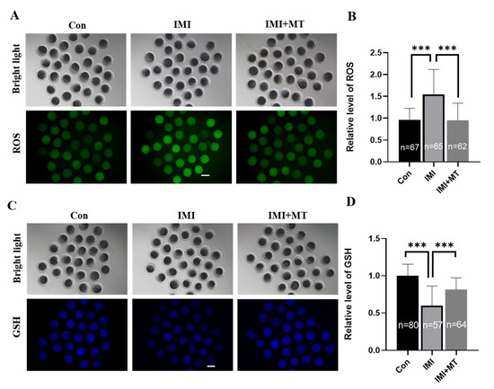 Intracellular ROS and GSH play multiple roles in redox regulation and cell signaling [42]. However, during in vitro culture, excessive accumulation of ROS can lead to mitochondrial dysfunction, apoptosis, and meiotic arrest, resulting in impaired embryonic development [43,44,45]. GSH is a major, non-protein sulfhydryl compound in mammalian cells that plays a crucial role in protecting oocytes against oxidative damage [46]. Previous papers have reported that IMI can cause ROS-mediated lipid peroxidation in Caco-2 and HepG2 cells [47]. Furthermore, IMI-induced oxidative stress might be associated with the NF-kappaB/JNK signaling pathway [48] and lead to oxidative stress and DNA damage in earthworms, reducing the expression of SOD and CAT related antioxidant stress genes [49]. Melatonin, as a free radical scavenger, promotes oocyte maturation and gene expression related to antioxidant pathways [50]. Specifically, supplementation of melatonin during in vitro maturation of bovine oocytes can alleviate oxidative stress caused by Juglone, alleviate mitochondrial dysfunction and oxidative stress of mouse oocytes after exposure to Sudan I, and improve oxidative stress and apoptosis of pig oocytes induced by ochratoxin A [16,51,52]. As shown in Figure 2 and Figure 3A, the results of this study showed that IMI exposure to porcine oocytes can significantly increase intracellular ROS levels, reduce GSH levels and the expression of antioxidant genes including catalase (CAT), superoxide dismutase 1 (SOD1), and silent information regulator 1 (SIRT1). We also found that melatonin can effectively alleviate these effects, and thus oxidative stress caused by IMI exposure.