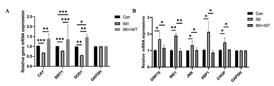 Endoplasmic reticulum stress can also lead to decreases in oocyte maturation rates. We examined endoplasmic reticulum stress-related genes—GRP78, IRE1, JNK, XBP1, and CHOP—and found that MT can alleviate the increases in expression of endoplasmic reticulum stress genes associated with IMI exposure (Figure 3B).