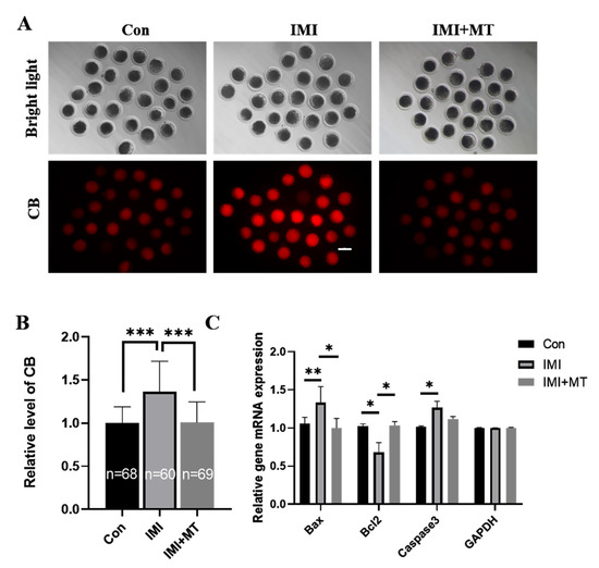 The CB signal was significantly higher in the IMI-exposed group compared with the control group (1.37 ± 0.35 vs. 1.00 ± 0.19, p < 0.001), while there was a negligible CB signal change in the IMI + MT group (1.01 ± 0.24 vs. 1.00 ± 0.19, Figure 4A,B). In addition, MT supplementation attenuates the effects of IMI exposure on the expression of apoptosis-related genes (Figure 4C).