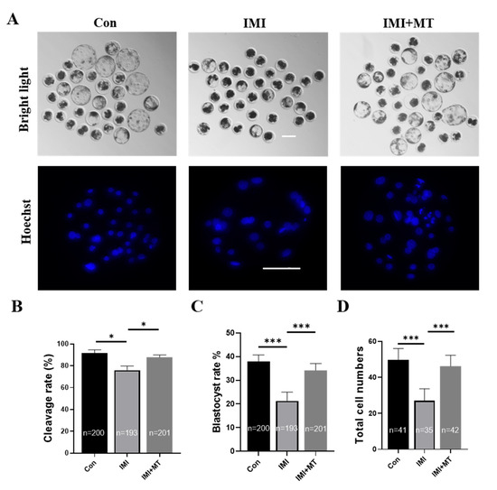 We further evaluated whether IMI exposure during the IVM period impaired the developmental competence of parthenogenetically activated porcine embryos. The results show that IMI exposure had a negative effect (Figure 5A). As shown in Figure 5B–D, the cleavage rate (75.97 ± 3.84% vs. 91.48 ± 3.12% on day 2, p < 0.05), blastocyst formation rate (21.33 ± 3.70% vs. 38.02 ± 2.68% on day 7, p < 0.001), and the total cell numbers (27.03 ± 6.57 vs. 49.71 ± 6.34, p < 0.001) of the parthenogenetically activated embryos generated from matured oocytes in the IMI-exposed group were significantly lower than those in the control group. However, when supplemented with MT, the damage caused by IMI exposure was alleviated, and cleavage rates (87.82 ± 2.13%), blastocyst formation rates (34.19 ± 2.91%), and the total cell numbers (46.19 ± 6.16%) were not significantly different from the controls.