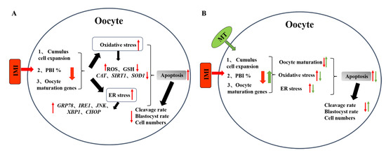 Hypothetical model of imidacloprid IMI and melatonin MT in oocyte maturation. The red arrow represents the negative effects of IMI on oocytes after contact. The green arrow represents the positive effect of MT supplementation on alleviating IMI. (A) The effect of IMI exposure on oocytes. IMI contacts oocytes to produce oxidative stress and endoplasmic reticulum stress, which have a negative impact on oocyte maturation and embryonic development potential, and ultimately lead to apoptosis. (B) MT alleviates the negative effects of oocytes exposed to IMI. MT can alleviate oxidative stress and endoplasmic reticulum stress, make oocytes mature healthily, and improve embryonic development potential.
