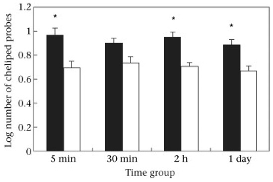 Hermit crabs that were shocked within their shells (light bars) investigated new empty shells using fewer cheliped probes before occupying those shells than did non-shocked crabs (dark bars) (F1,112 = 33.528, p < 0.0001). The times between the shock and the new shell being offered were varied and the effect of shock was significant (asterisks denote p < 0.05) for the 5 min, 2 h, and 1-day groups. From Appel and Elwood 2009 [36].