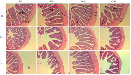 As shown in Figure 1, for the FM diet, the intestinal structure of each layer is clear and complete; the tightly connected single-layer columnar epithelial cells and a large number of intestinal mucosal goblet cells were observed. In comparison with the FM diet, we observed the destroyed intestinal structure of MI and DI of the SBM diet, the irregular arrangement of single-layer columnar epithelial cells, and the reduced number of intestinal mucosal goblet cells, as well as intestinal epithelial cells detached from lamina propria. Compared with the FM diet, both G-4.5 and G-10 diets had a slight damage of intestinal structure. However, the degree of intestinal structure damage of the G-10 diet was greater than that of the G-4.5 diet.