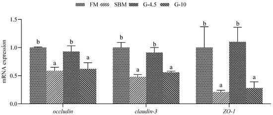 The intestinal mRNA levels of occludin, claudin-3 and ZO-1 genes in the SBM and G-10 diets were down-regulated (p < 0.05) compared with the FM diet. However, the mRNA levels for the three genes in the G-4.5 diet were similar (p > 0.05) to those in the FM diet (Figure 2).