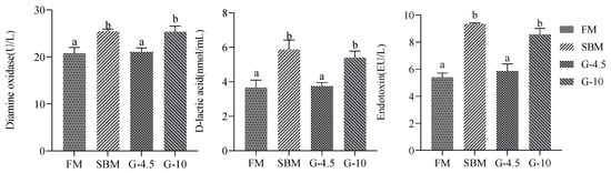 Figure 3 showed that diamine oxidase activity, D-lactic acid and endotoxin contents in the intestine of G-10 and SBM diets were superior (p < 0.05) to those in the FM diet and G-4.5 diet. There were similar (p > 0.05) values for the three indices between the G-4.5 diet and the FM diet and between the SBM diet and the G-10 diet.