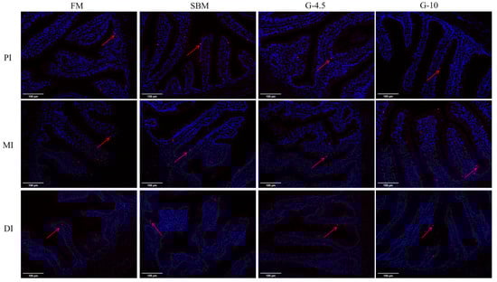 Changes of middle-intestinal-cell apoptosis in fish fed the experimental diets across a 56-day growth trial period. The red arrow indicate that location of apoptotic cells. PI, MI and DI represent the proximal, middle and distal intestines, respectively; red particles refer to apoptotic cells. FM, fish meal diet (FM diet); SBM, 30% FM was replaced by soybean meal in FM diets, without glycinin supplementation; G-4.5 and G-10, 4.5% and 10% glycinin were added in FM diets, respectively.