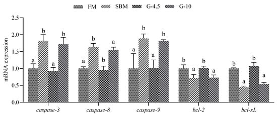 The results of gene expression related to intestinal cell apoptosis are shown in Figure 5. The intestinal expression levels of caspase-3, caspase-8 and caspase-9 genes were highest in the SBM among the four diets, followed by the G-10 diet, and the values for the three genes of SBM and G-10 diets were superior (p < 0.05) to those of the FM diet. However, no differences (p > 0.05) in intestinal expression levels of caspase-3, caspase-8 and caspase-9 genes were observed between FM and G-4.5 diets; the changes of intestinal mRNA levels of bcl-2 and bcl-xL genes were opposite to those of caspase-3, caspase-8 and caspase-9 genes in response to dietary treatments.