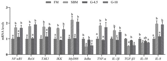 Figure 6 shows that mRNA levels of the NF-κB1, RelA, TAK1, IKK, MyD88, TNF-α, IL-1β, and IL-8 genes of the SBM and G-10 diets were up-regulated (p < 0.05) compared with the FM diet, and the values for the eight genes in the G-4.5 diet were similar (p > 0.05) to those of the FM diet. Opposite to the changes of mRNA levels of the eight above-mentioned genes, both the SBM and G-10 diets had down-regulated (p < 0.05) expression levels of IκBα, TGF-β1 and IL-10 genes in comparison with those of the FM diet. The G-4.5 diet had a mRNA level of the three genes similar to that of the FM diet.
