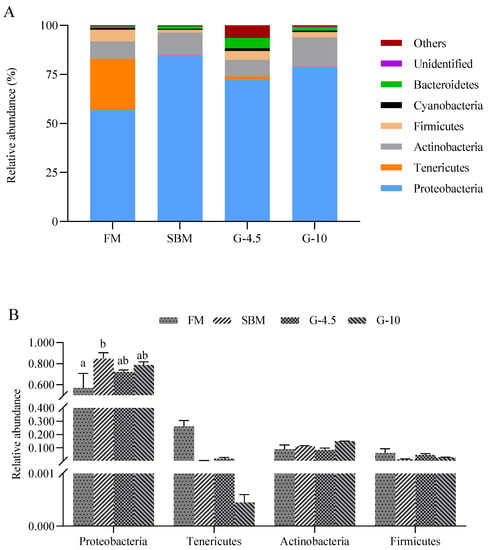 As shown in Figure 7A, Proteobacteria (73.2%), Tenericutes (7.0%), Actinobacteria (10.9%), Firmicutes (3.7%), Cyanobacteria (0.9%) and Bacteroidetes (2.2%) were the dominant phyla in the intestines of orange-spotted groupers. Figure 7B shows the relative abundance of the first four dominant phyla among treatments. The relative abundance of Proteobacteria of the SBM diet was superior (p < 0.05) to that of the FM diet, but was similar (p > 0.05) to those of the G-4.5 and G-10 diets. There were no (p > 0.05) significant differences in Actinobacteria and Firmicutes among the four diets.