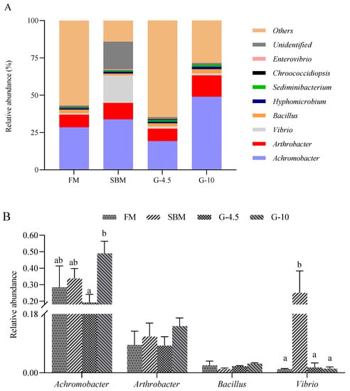 As shown in Figure 8A, at the genus level, the dominant bacterial genera of the intestine in the four diets were Achromobacter (32.6%), Arthrobacter (10.5%), Vibrio (5.6%), Bacillus (2.1%), Hygromicrobium (1.3%), Sediminibacterium (0.9%), Chrococcidiopsis (0.3%) and Enterovibrio (0.2%). Figure 8B lists the relative abundance of the first four dominant genera. The relative abundance of Achromobacter in the G-10 diet was superior (p < 0.05) to that of other diets. The abundance of Arthrobacter and Bacillus did not (p > 0.05) differ across treatments.