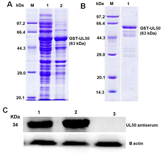 To obtain the highest yield of the fusion protein, the expression plasmids were introduced into Escherichia coli Rosetta (E. coli) strain BL21 (DE3) (TransGen Biotech, Beijing, China). The expression of the glutathione S-transferase (GST) fusion protein was controlled by an isopropyl-β-D-thiogalactopyranoside (IPTG)-inducible lac operator sequence. For induction, the UL50 bacterial culture was treated with 0.2 mM IPTG and incubated at 20 °C for 16 h. The bacterial cells were harvested by centrifugation (10,000 RPM/10 min), then resuspended in 1× PBS and lysed through sonication. The GST fusion proteins were subsequently eluted from the lysate using Glutathione Sepharose 4B (GE Healthcare, Uppsala, Sweden) and solubilized in SDS loading buffer (containing 10% SDS, 50% glycerol, 0.05% bromophenol blue, 0.5 M Tris-HCl, pH 6.8 and 100 mM DTT). Then, the pellet was boiled at 95 °C for 10 min and centrifuged briefly. The purified eluted protein was analyzed via sodium dodecyl sulfate–polyacrylamide gel electrophoresis (SDS-PAGE) using 12% polyacrylamide gel (Bio-Rad, Hercules, CA, USA).