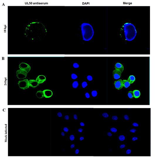 31]. In pseudorabies virus (PRV), the UL50 gene encodes the pUL50 protein, which is involved in the nuclear egress of viral particles. While the specific localization of pUL50 in PRV has not been extensively studied, it is expected to localize primarily in the nuclear membrane, similar to its localization in related alphaherpesviruses, like HSV-1.