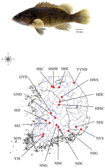 C. herzi populations were sampled at 19 points in 2019 using fishing nets; detailed information is given in Figure 1 and Table S1. C. herzi is endemic to Korea, and research on it does not require permission for animal ethics. The pectoral fin tissues of the fish samples were preserved in 99% ethanol. Genomic DNA was extracted from the preserved tissue of all specimens using the DNeasy Blood & Tissue kit (QIAGEN, Germantown, MD, USA) according to the manufacturer’s instructions.