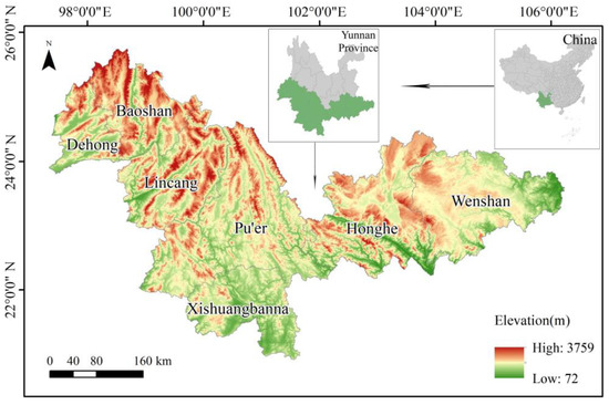 The study area is the cities and autonomous prefectures where the main protection objects include Asian elephants or habitats suitable for the survival of Asian elephants in the provincial and national nature reserves in the “National List of Nature Reserves (2015)”. In our survey of these sites, we included Baoshan, Lincang, Pu’er, Dehong, Xishuangbanna, Honghe, and Wenshan, a total of 3 cities and 4 autonomous prefectures (Figure 1). These locations are located within the south of Yunnan Province, China, between 21°05′~25°50′ north latitudes and 97°29′~106°14′ east longitudes, bordering Myanmar, Laos, and Vietnam, with a total area of 181,128 km2 and an elevation of 72~3759 m. The study area is located in the low-latitude monsoon climate zone, which is the area most affected by the southwest monsoon in China. The study area is rich in habitat types and is considered a global biodiversity hotspot [17].