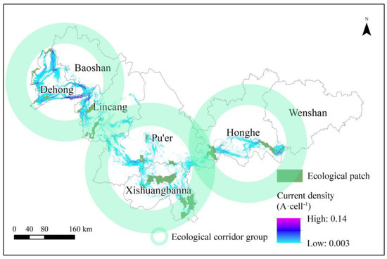 Circuit theory also introduces a concept known as an “ecological pinch point”. When an area in the model has a high current density in the ecological network, the possibility of biological movement is high, and it has strong irreplaceability [33,34]. Combining the minimum resistance model and the circuit theory model was used to identify ecological pinch points [35]. However, when there is large resistance value in the surrounding area, biological movement is compressed in a relatively narrow range, resulting in a “pinch point” through which a large amount of traffic is funneled through a relatively small aperture in the model network [36]. In this paper, a 10 km buffer zone is set for ecological patch I. The natural breakpoint method is used to divide the current density into three levels, and the area in the buffer zone with the highest current density is considered an ecological pinch point.