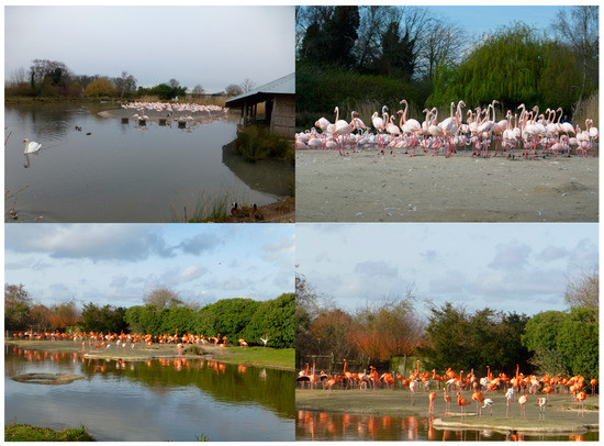 Free-living Mallards (Anas platyrhynchos), Tufted Ducks (Aythya fuligula), Moorhens (Gallinula chloropus), Coots (Fulica atra), Greylag Geese (Anser anser), Mute Swans (Cygnus olor), Grey Herons (Ardae cinerea), various gulls (Laridae), and pigeons (Columbidae) could be seen within the flamingo enclosures. This study utilised photographs taken for data collection for a larger project that investigated social bonds across all six species of captive flamingo housed by WWT. Further information on this project can be found in [37,38,39,40]. Photographs were taken on a Panasonic Lumix T5 digital camera. Ethical review was provided by the Animal Welfare & Ethics Committee of WWT for the original data collection for the social networks project, and this case study was ethically reviewed by the Ethics Committee of Sparsholt College, Hampshire. Overall, 8680 individual data points (Greater Flamingos—4588; Caribbean—4092) were collected retrospectively from 825 photographs taken between January 2014 and December 2015. For the original data collection, photographs were captured at four times per day, 10:00, 12:00, 15:00, and 16:30 (depending on season and bird housing) and full methodological details for the original research for which these images were captured is available in Rose and Croft [37] and Rose and Croft [39]. Photographs captured the entire enclosure and flock within, as well as close-up views of individual subgroups of birds. From the overall sample of photographs across these two years, only those that contained juvenile flamingos were used for this investigation. This allowed quantification of where flamingos were, based on their location in the whole enclosure photo, and, in comparison, the location and position of other birds around them. The same researcher (AL) collected all data from all photographs. An example of a flock-wide and close-up photograph for each flamingo species is shown in Figure 1.