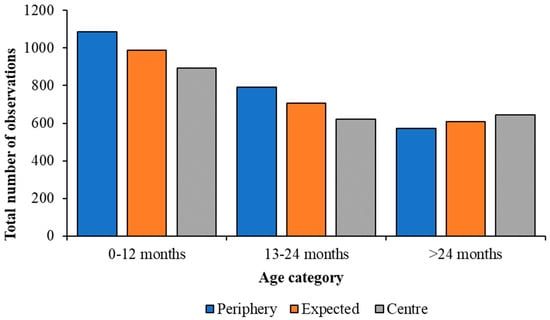 Juvenile Greater Flamingos up to the age of 24 months spent more time at the periphery of the flock than the centre, whilst individuals over 24 months of age were observed more at the centre (Figure 3). Chi-squared analyses showed a significant difference in all three age categories. Juveniles up to 12 months were observed at the periphery of the flock 1085 times and at the centre 894 (χ2 = 18.43; df = 1; p < 0.001), 13–24-month-old individuals were observed at the periphery 791 times and at the centre 622 times (χ2 = 20.21; df = 1; p < 0.001), whilst sub-adults were observed significantly more in the centre of the flock (643 times) compared with at its periphery, 572 times (χ2 = 4.15; df = 1; p = 0.042).
