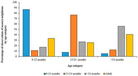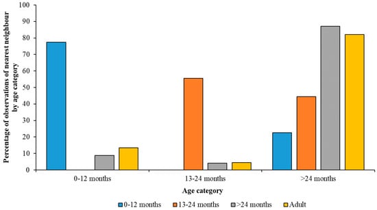 Figure 9 (data on 0–12-month-old birds) and Figure 10 (data on >24 month old birds) show the fluctuations in nearest neighbour age category over the two years when plotting observations of the 0–12 month juveniles, the 13–24 month juveniles, and the over-24 month juveniles as the age category of an associate.