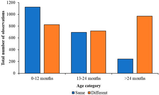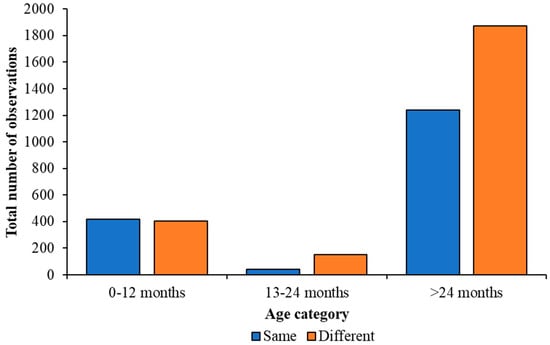 Comparison of the number of times a Greater Flamingo was observed with a nearest neighbour from the same age category as themselves or with a bird from a different age category. Blue bars show observations of a bird associating with the same age category and orange bars show observations with a different age category. Older flamingos were more likely to have a nearest neighbour of an older bird compared with birds in a younger age category.