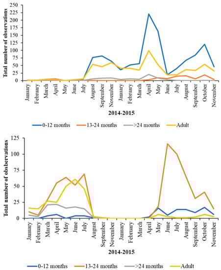 There was a significant relationship between the aging of the juvenile flamingo and their choice of nearest neighbour. For Greater Flamingos aged 0–12 months, there was a significant influence of year (χ = 13.53; df = 1; p < 0.001), time of day (χ = 18.68; df = 2; p < 0.001), month (χ = 333.3; df = 10; p < 0.001), and age category (χ = 428.6; df = 3; p < 0.001) on changes in the flamingo’s nearest neighbour’s age over time. For Greater Flamingos aged 13–24 months, there was also a significant influence of year (χ = 22.77; df = 1; p < 0.001), time of day (χ = 57.58; df = 2; p < 0.001), month (χ = 67.14; df = 10; p < 0.001), and age category (χ = 155.46; df = 3; p < 0.001) on the change in the age of its nearest neighbour over time. For sub-adult Greater Flamingos (>24 months), there was no significant effect of year on the choice of nearest neighbour (χ = 0.76; df = 1; p = 0.383) but the time of day (χ = 12.08; df = 2; p = 0.002), month (χ = 66.32; df = 10; p < 0.001), and age category of the nearest neighbour choice (χ = 68.76; df = 3; p < 0.001) were significant predictors. Across each category of Greater Flamingos, the number of associations was higher at midday and in the afternoon when compared with morning observations.