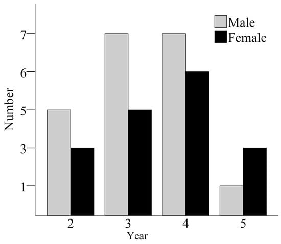 The age ranged from 2 to 5 yrs in both males and females. The age structure is shown in Figure 2. Individuals of 3 and 4 years old were the most numerous in both sexes. There was no significant difference between the average ages of both sexes (male: n = 20, mean = 3.20 ± 0.89; female n = 17, mean = 3.53 ± 1.01; ANOVA, F1,36 = 1.11, p = 0.299).