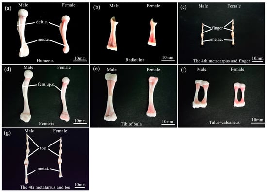 Comparison of limb bones features of male and female B. gargarizans. (a–c) represent the humerus, radioulna, 4th metacarpus, and 4th finger in the forelimb bones, respectively. (d–g) represent the femoris, tibiofibula, talus–calcaneus, 4th metatarsus, and 4th toe in the hindlimb bones, respectively. Abbreviation: delt.c., deltoid crest; med.c., medial crest; metac., metacarpus; fem.up.c., femoral upper crest; metat., metatarsus. Bars = 10 mm.