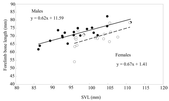 Linear regression of the total length of forelimb bones on the SVL of male (closed circles, solid line) and female (open circles, broken line) B. gargarizans.