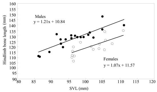 The linear regression of eight skeletal features (femoris, tibiofibula, talus–calcaneus, and foot lengths; femoris, tibiofibula, and talus–calcaneus weights; and femoral upper crest area) on the SVL of males and females was highly significant (p < 0.05), and the slopes were homogeneous for all comparisons between sexes (p > 0.05). Details are summarized in Table 3. MANCOVA showed that the five skeletal features (i.e., femoris, tibiofibula, talus–calcaneus, and foot lengths and the femoral upper crest area) of males significantly exceeded 1.02–1.13 times those of females. Especially, although the talus–calcaneus weight of males statistically was smaller than that of females, in fact, the difference in their absolute weight was very small (Table 4). However, the femoris and tibiofibula weights did not differ statistically between sexes (Table 4). The total length of the hindlimb skeleton regressed significantly on the SVL for both sexes (Figure 5; males: n = 20, R2 = 0.740, β = 0.860, F = 51.14, p < 0.001; females: n = 17, R2 = 0.440, β = 0.663, F = 11.76, p = 0.004) with homogeneous slopes (t = 0.405, p = 0.688). Independent of body size and age, the total hindlimb skeleton length of males exceeded 1.06 times that of females (Table 4).