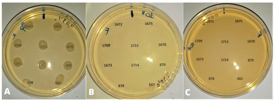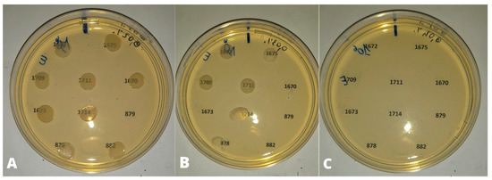 Bacterial density of 106 UFC/mL. (A) 0.02% (0.2 µL/mL) of CEO: no inhibition of bacterial growth except for strain 879; (B) 0.03% (0.3 µL/mL) of CEO: growth inhibition of strains 1670, 1673, 879, 882; (C) 0.04% (0.4 µL/mL) of CEO: inhibition of bacterial growth.