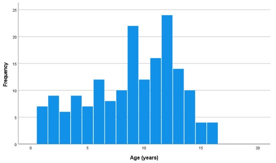 Age distribution of 110 cats treated for malignant lymphoma with cyclophosphamide, vincristine, and prednisolone (COP) at the Utrecht University Clinic for Companion Animals, between 2011 and 2020.