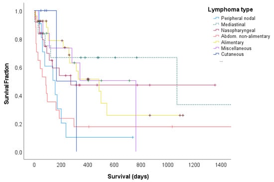 The median survival time for all cases (274 days) is comparable to or even better than some of the older studies [31,37,50] as well as compared to the results from studies reported in the past in the Netherlands. The median DFP for cases that went into CR in the present study (763 days) was much better than in the two periods before. Especially the nasopharyngeal, mediastinal, and miscellaneous subtypes had a large increase in median DFP with >1357, 1071, and 763 days, respectively. Possible explanations are still lacking.