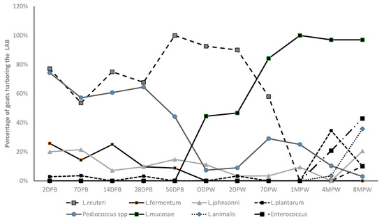 | LAB spp. | 2 Days (35) | 7 Days (28) | 14 Days (28) | 28 Days (31) | 56 Days (34) | 0 DPW (28) | 2 DPW (32) | 7 DPW (31) | 1 MPW (32) | 4 MPW (30) | 8 MPW (30) |