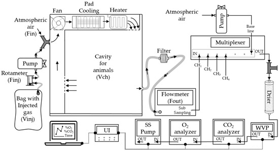 The open-circuit system integrated into the trough airflow of pull-mode calorimetric chambers is commonly employed in farm animal trials [2,3,6,9,12]. This system measures the concentration of gases (O2 and CO2) and their rate of change, considering the airflow from the atmosphere into the chamber. Subsequently, the volume of gas exchanged (VO2 and VCO2) over time can be calculated. However, before obtaining the final HP value, a series of computations are applied to preserve signals associated with the metabolic response, identify atypical signals resulting from extraneous factors, and suppress measurement noise [12,13,14].
