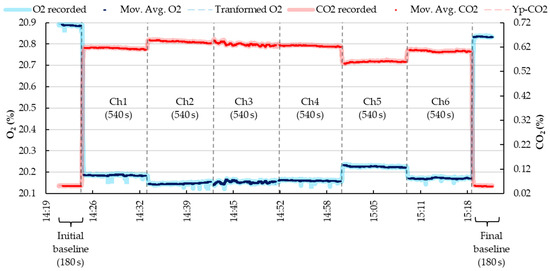 After applying the Bartholomew transformation, the CO2 concentration is transformed to the time ti. Since the signals were recorded every second, a moving average (n = 10) was employed as a criterion to reduce noise and synchronize the O2 and CO2 analyzer signals.