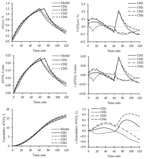 The data analysis for the recovery test followed the same calculation procedures as described in the simulation. Data was recorded at one-second intervals and then averaged every minute. Several parameters were evaluated to assess the accuracy of the system in each chamber, including the fractional concentration of CO2out, ΔVCO2, and cumulative ΔVCO2. The error (ε) and residual standard deviation (RSD) were calculated for each chamber and minute to evaluate the results.