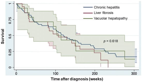 A total of 90 canine patients with hepatic parenchymal lesions were included in this study. The histological diagnoses identified in dogs were idiopathic chronic hepatitis (61%, 55/90 dogs), liver fibrosis (23%, 21/90 dogs), and vacuolar hepatopathy (16%, 14/90 dogs). The patients’ baseline characteristics are presented in Table 1. Subjects in the study group consisted of 43 male (47.8%) and 47 female (52.2%) dogs with an average age of 10.2 ± 0.5 years. The mean age of dogs that survived beyond two years (10.6 ± 3.4 years) was marginally higher compared to those that succumbed within two years (9.9 ± 2.9 years, p = 0.358). No significant differences were observed in sex between dogs that had died or remained alive within two years. Similarly, the size categorization of dogs (small, medium, large) did not exert a substantial influence on survival outcomes (p = 0.541). Biochemical analyses revealed noteworthy insights, with dogs experiencing shorter survival periods exhibiting markedly elevated GGT levels (26 ± 57 U/L) in contrast to longer-surviving counterparts (6 ± 4 U/L, p = 0.016) (Table 1). Additionally, triglyceride levels were notably lower in the group with limited survival (139 ± 101 mg/dL) compared to those that survived beyond two years (259 ± 346 mg/dL, p = 0.046). The aPTT was also significantly higher (p = 0.006) in the dogs that died within two years. Conversely, no substantial statistical differences (p > 0.05) were observed in other biochemical markers, including ALT, AST, ALP, albumin, BUN, bilirubin, creatinine, cholesterol, PT, and TT. Clinical indicators such as hepatic encephalopathy, ascites, hypoalbuminemia, and hyperbilirubinemia displayed limited associations with the survival of dogs within two years (Table 1). Overall, the one-, two-, and five-year mortality were 28.9%, 45.6%, and 78.9%, respectively. The analysis of the Kaplan–Meier survival curve did not show any significant correlation between the histopathological classification of hepatobiliary diseases and survival (Figure 1).