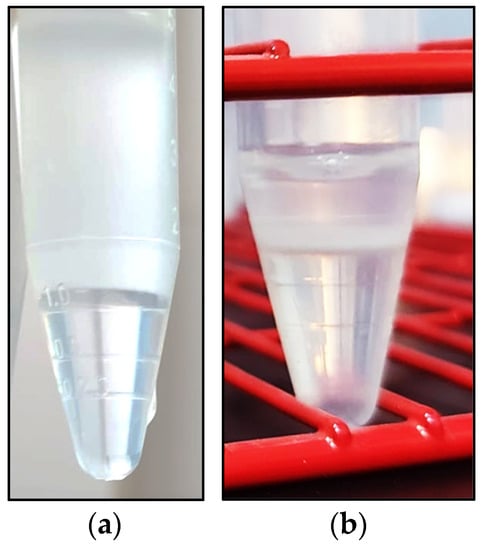 After evaluation of motility, two 8 mL aliquots of the TCF diluted samples were placed in 15 mL falcon tubes. Only Samples with a total motility ≥60% were used. One tube was kept as a control (Centr_Con) whilst, in the other one (Centr_Cush), 1 mL of Iodixanol-based cushion medium (Cushion Fluid, Minitube), kept at room temperature, was carefully placed under the extended semen using a 2 mL syringe and a 9 cm spinal needle without the needle rod (Figure 1a). The two aliquots were centrifuged at 900× g for 20 min at room temperature with a swing rotor centrifuge (Hermle, Z326K, Wehingen, Germany) [19,28].