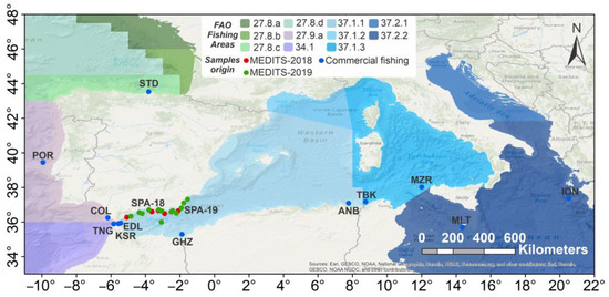 Map of geographical distribution of the sample analysed. Geographical coordinates are available only for the MEDITS-2018 (red dots) and MEDITS-2019 (green dots) samples. Refer to Table 1 for location codes. Location codes refer to landing ports. Sources (basemap): Esri, GEBCO, NOAA, National Geographic, DeLorme, HERE, Geonames.org, and other contributors. Maps were created using ArcMap™ (version 10.8) software of ArcGIS (https://www.arcgis.com/, accessed on 16 January 2023). ArcGIS® and ArcMap™ are the intellectual property of Esri and are used herein under license.