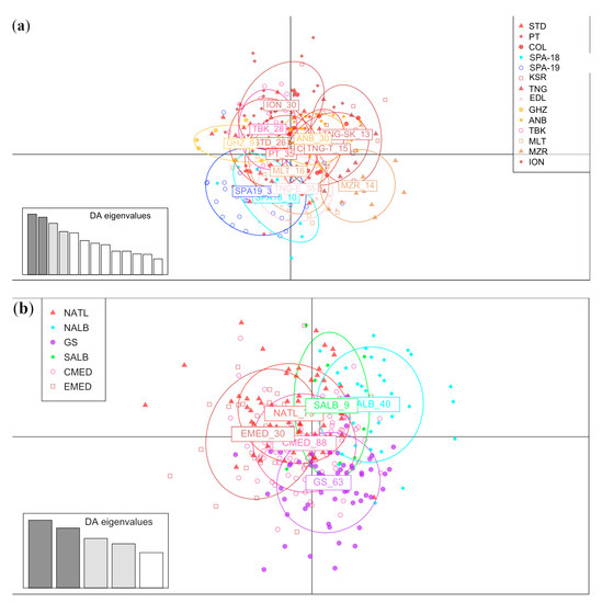 (a) Result of DAPC analysis performed on 14 locations. (b) Result of DAPC analysis performed on 6 macro-areas.