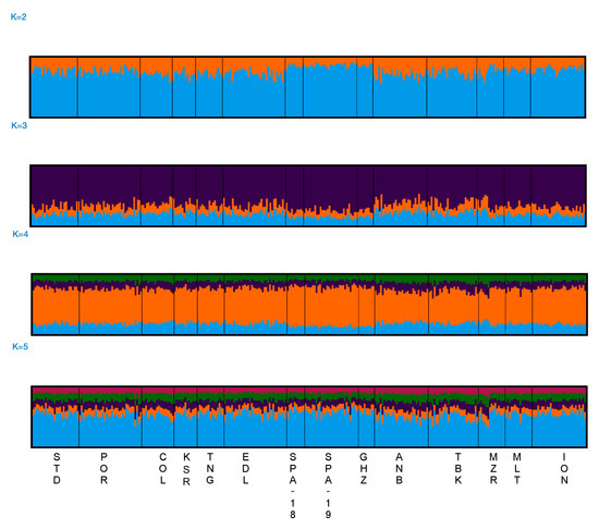 Summary plot of the STRUCTURE analysis from K = 2 to K = 5. Each individual is represented by a single vertical line on the x-axis. Coloured segments represent the membership of individuals in the population clusters. Results are shown for the 14 locations using 14 microsatellite loci.