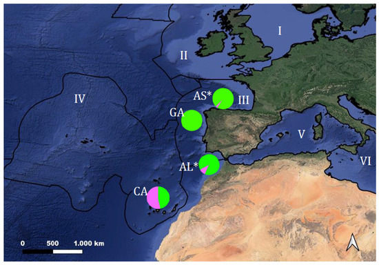 Geographical locations of octopus populations sampled in the present study for genetic analyses of mitochondrial DNA. Sampling sites are AS (Asturias), GA (Galicia), AL (Algarve) and CA (Canary Islands). Colors represents the two clades found for the mitochondrial DNA analysis (in green, haplogroup β, and in pink, haplogroup α, as in Quinteiro et al.’s [30] study). Numbers indicate different marine subregions following the Marine Strategy Framework Directive—MSFD (Directive 2008/56/EC of the European Parliament and of the Council of 17 June 2008, establishing a framework for community action in the field of marine environmental policy): I: North Sea, II: Celtic Sea, III: Bay of Biscay and the Iberian Coast, IV: Macaronesia, V: Western Mediterranean and VI: Ionian Sea. *: Populations sampled in two different fishing seasons. (Information available from the European Environment Agency).