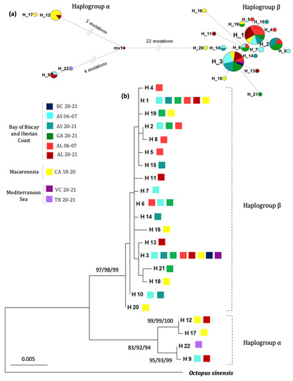 (a) Haplotype network built using median joining algorithm for octopus haplotypes (22) from the Northeastern Atlantic using the concatenated mitochondrial region (cox1 + CR). Circles represent different haplotypes and size is proportional to its frequency. Colors indicate each population and marine subregions are also indicated. The distance for 1 mutation is indicated to be counted from the center of each circle to another. The mv red circles indicate ancestral, extinct or not found haplotypes. (b) Maximum likelihood tree for the same haplotypes and samples also using the combined region of cox1 + CR. Bootstrap support for ML, MP and NJ analysis, respectively, is shown at the nodes (only bootstrap values over 70% are displayed). Octopus sinensis is added as an outgroup. The letters in the legend represent the sampling sites (BC (Basque Country), AS (Asturias), GA (Galicia), AL (Algarve), CA (Canary Islands), VC (Valencian Country) and TK (Turkey)). The numbers represent the years in which sampling was performed.